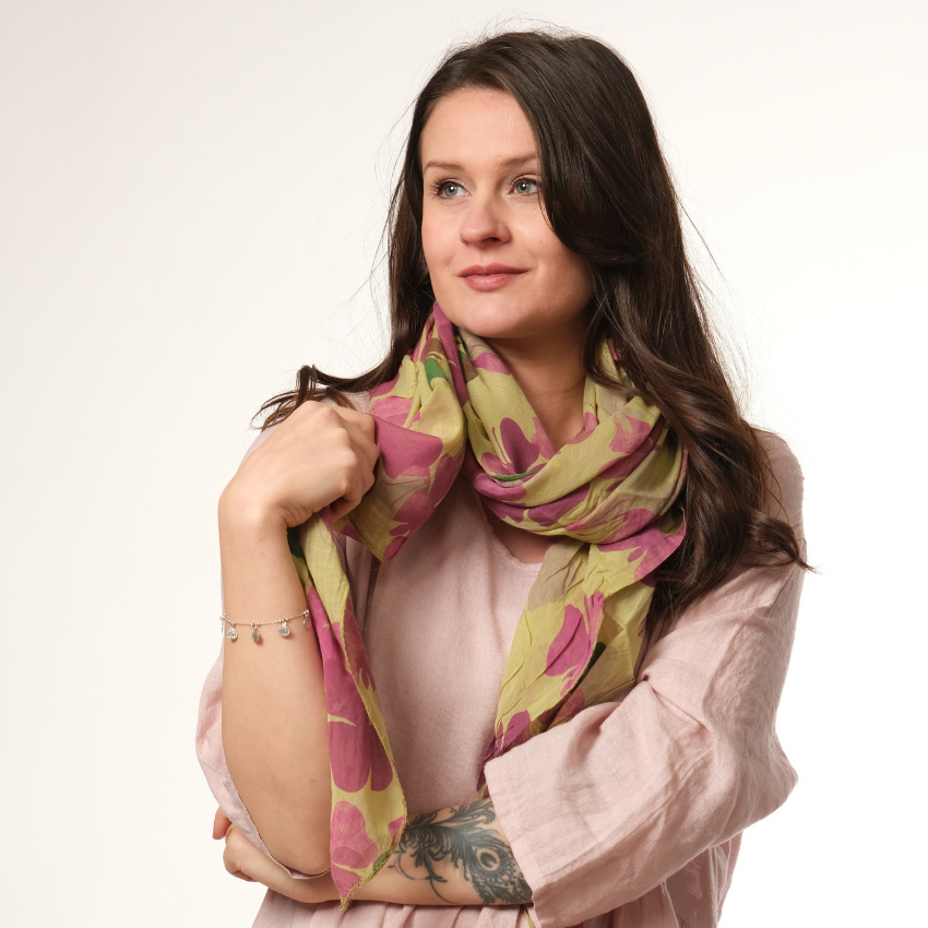Huivilla voit viimeistellä pukeutumisesi niin töissä kuin vapaa-ajallakin. Kylmemmälläkin säällä nämä huivit lämmittävät takin alla. Tämä huivi taipuu myös päähineeksi tai pannaksi, vain mielikuvitus on rajana. Tunne olosi mukavaksi sillä silkin ja puuvillan yhdistelmä ei kutita, pistele eikä hiosta. Kun on aika pestä huivi, pyöräytä helposti kevyellä käsinpesuohjelmalla pesukoneessa.