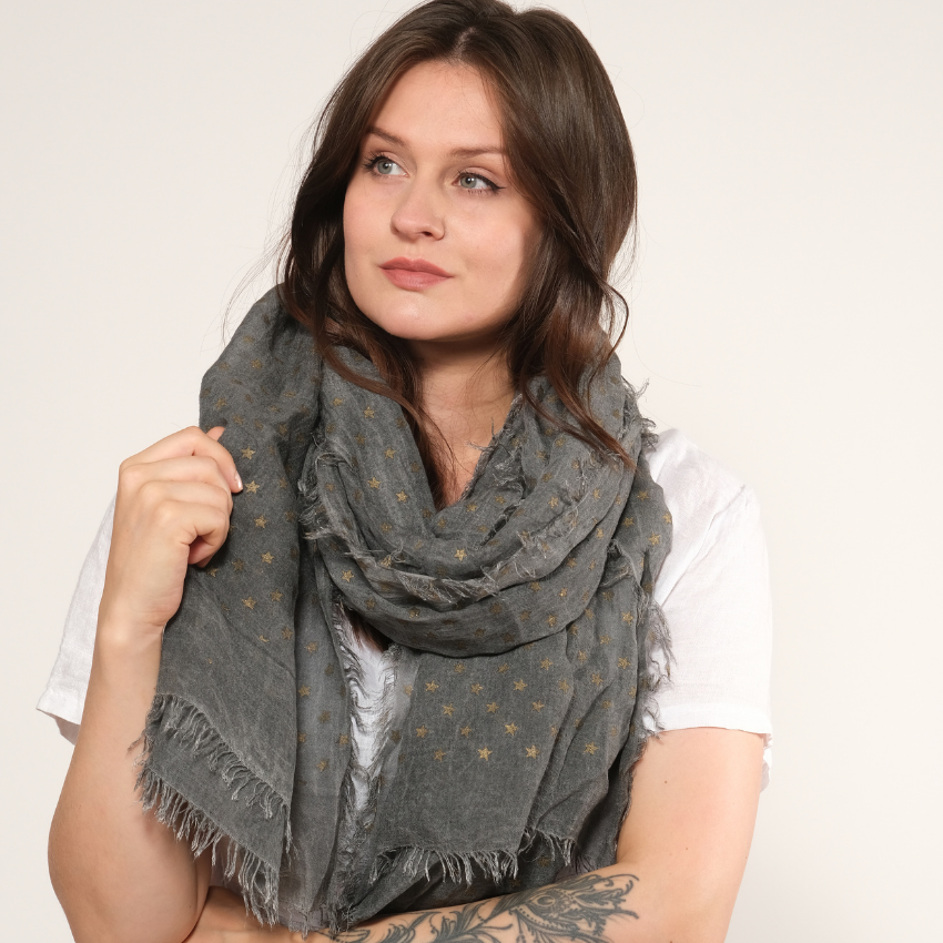 Pehmeä modaalihuivi kultaisilla tähdillä ja hapsuilla – hienovaraista säihkettä arkeen