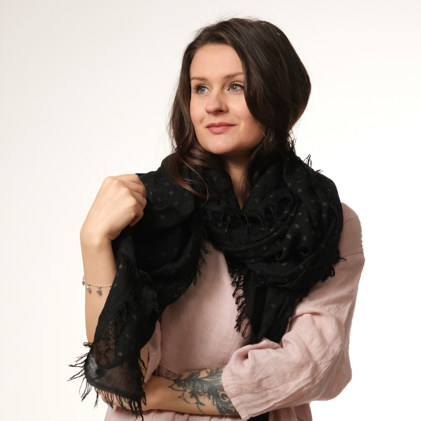 Pehmeä modaalihuivi kultaisilla tähdillä ja hapsuilla – hienovaraista säihkettä arkeen