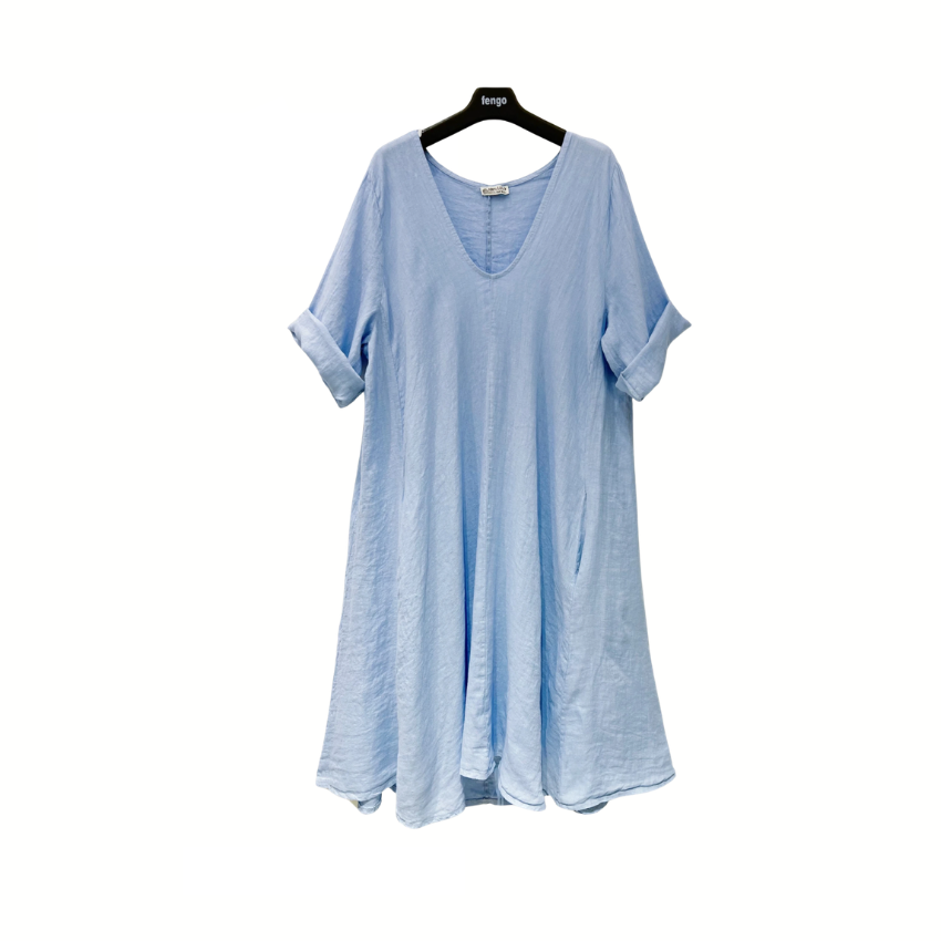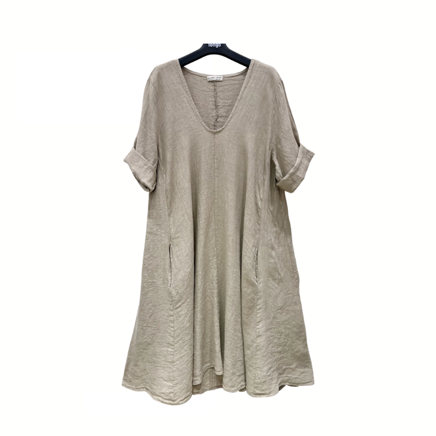 Leveähelmainen pellavamekko, jossa lyhyet hihat ja V-kaula-aukko – elegantti ja ylellinen valinta juhlaan.