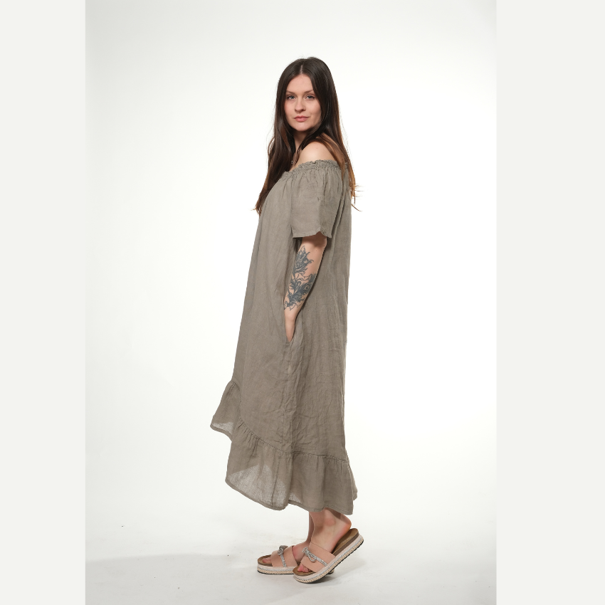 Tämä ajaton ja monikäyttöinen pitkä pellavamekko yhdistää rennon tyylikkyyden ja käytännöllisyyden. Helman kaunis frilla sekä lyhyempi etuhelma tuovat mekkoon kepeää liikkuvuutta ja ilmavuutta, tehden siitä täydellisen valinnan niin arkeen kuin juhlaankin.