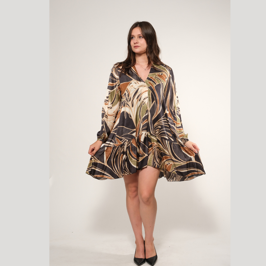 Tuo lämpimät sävyt pukeutumiseesi tällä upealla silkki-viskoositunikalla! Tunikan kaunis väripaletti – vihreä, ruskea, musta ja okra – hehkuu luonnon inspiroimana ja tekee siitä täydellisen valinnan viileämpien päivien tyylikkääseen arkipukeutumiseen.